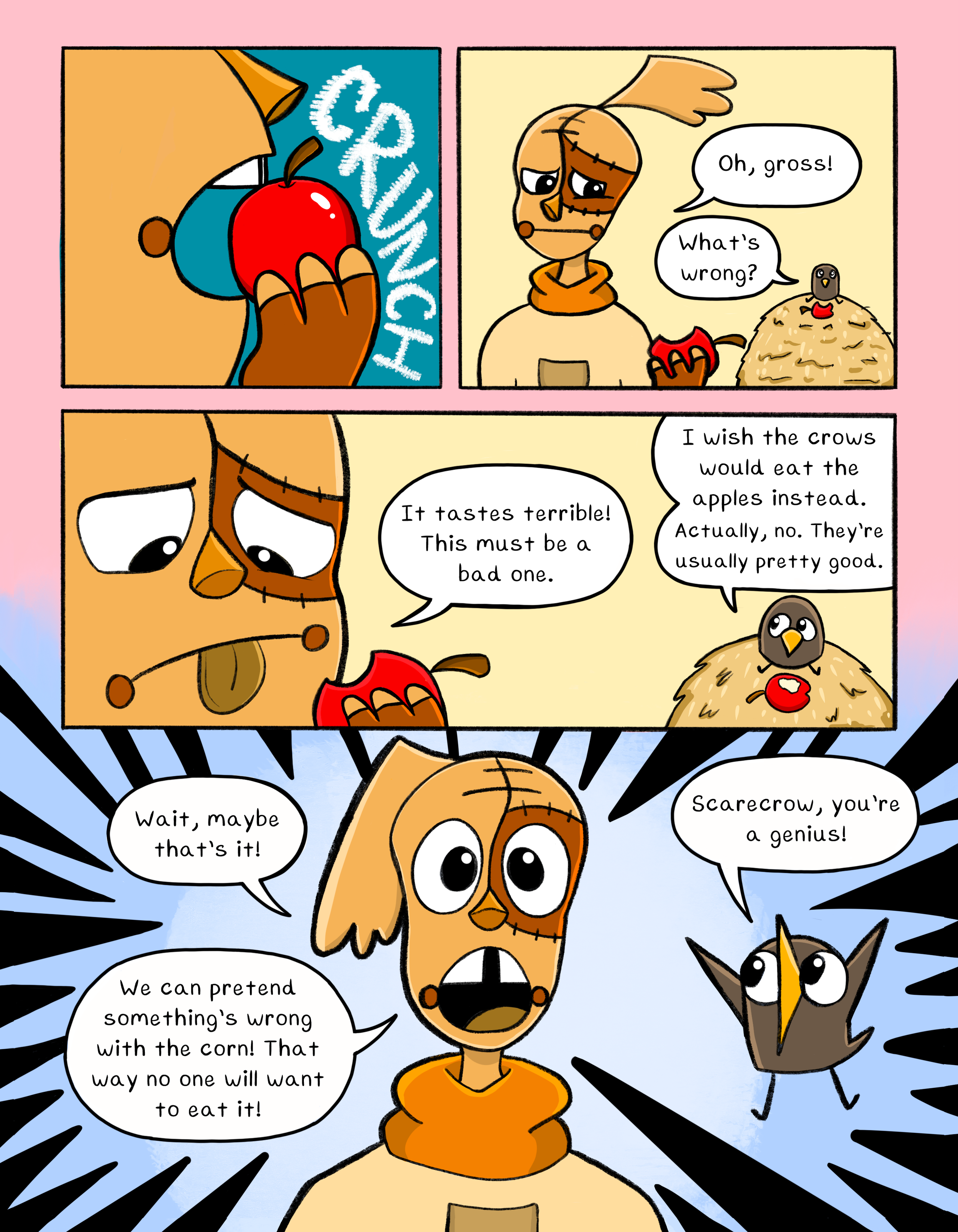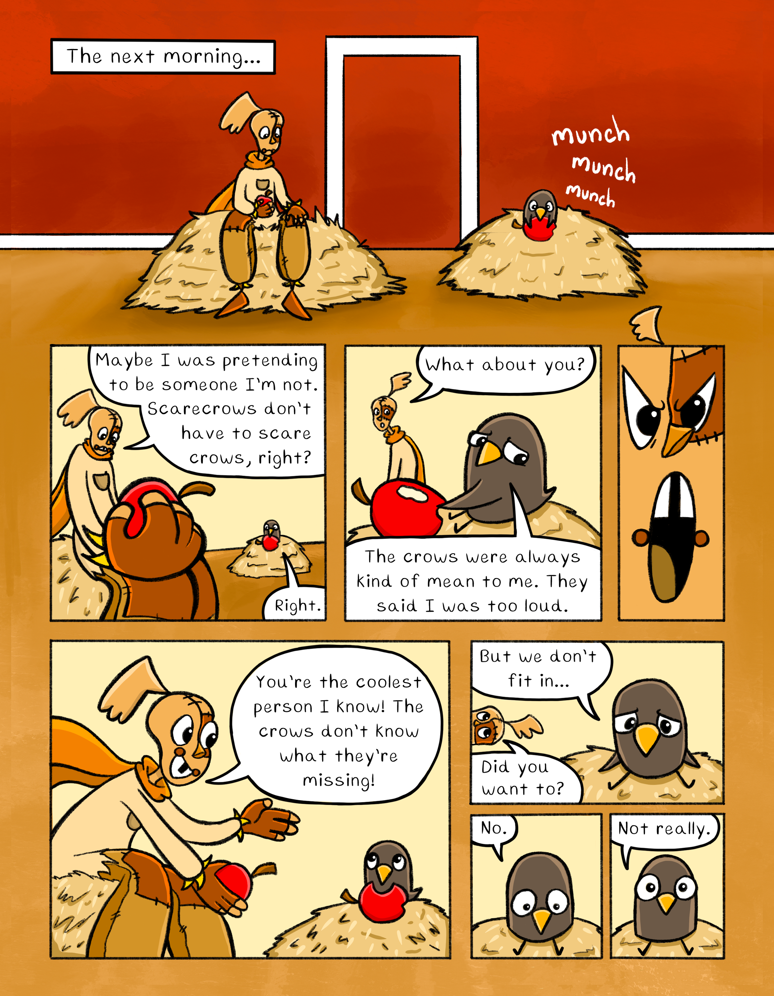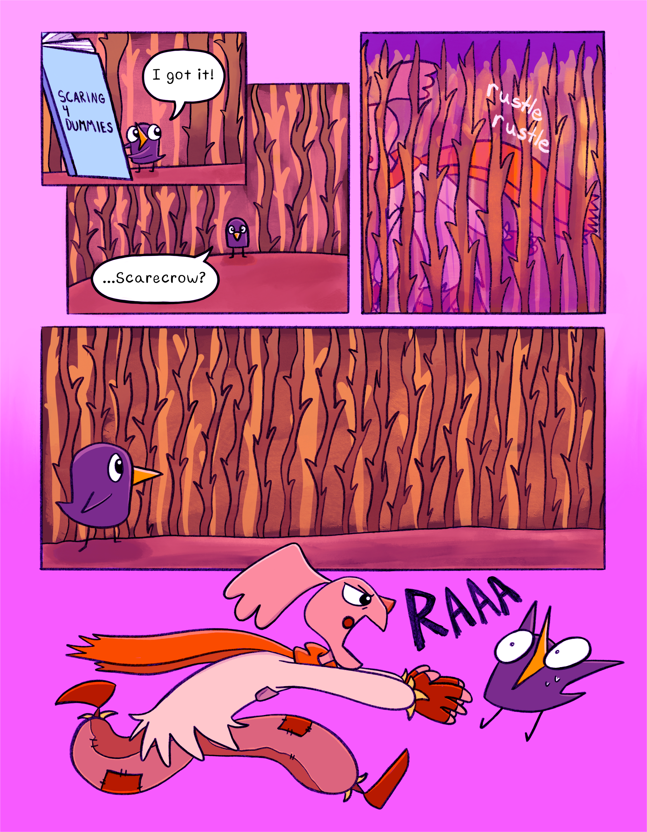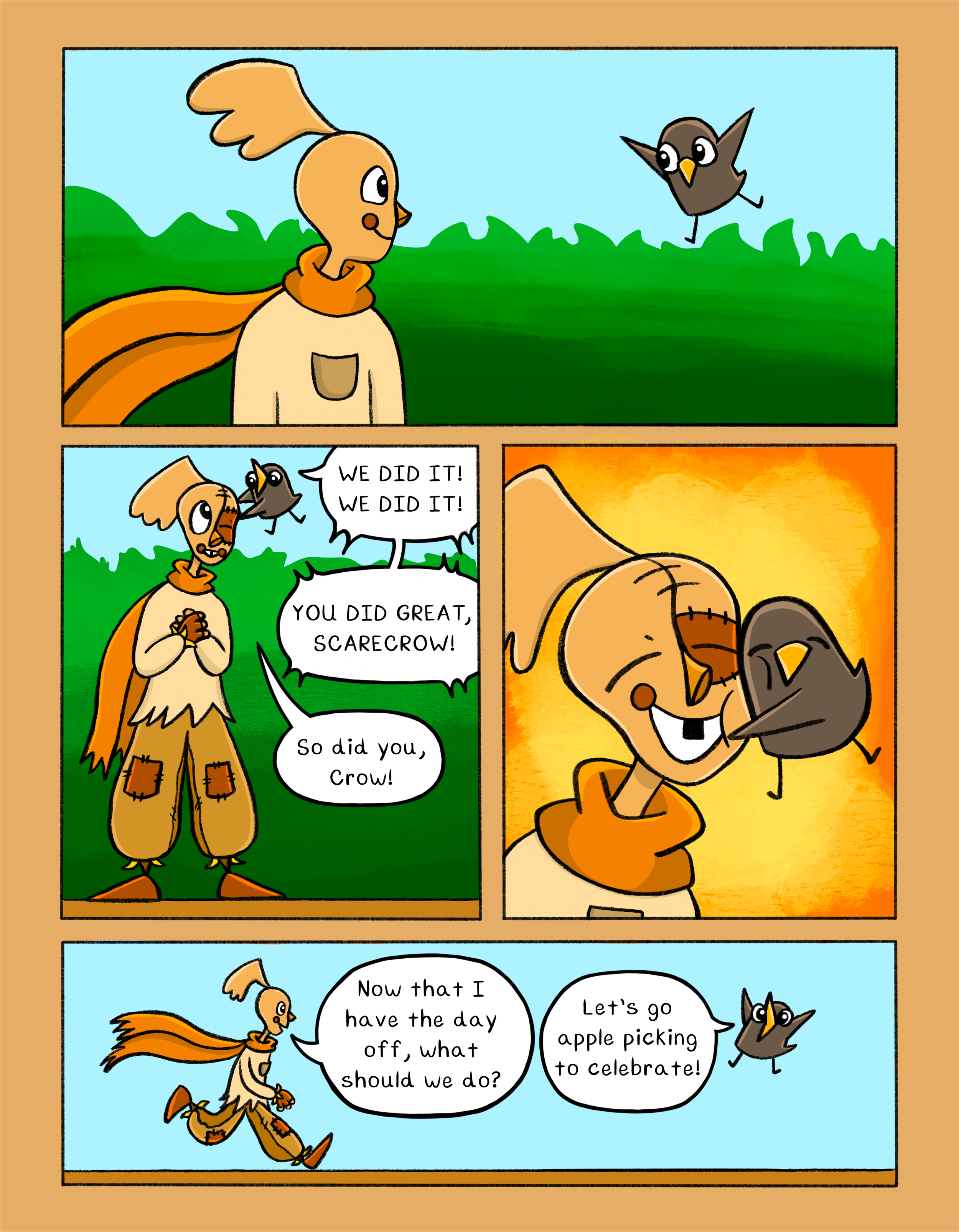 This full-color comic tells the story of a crow teaching a scarecrow to be scary. As my final thesis project at MIAD, my goal was to create a funny, relatable story that can be enjoyed by a young audience, and leave a smile on everyone’s face.